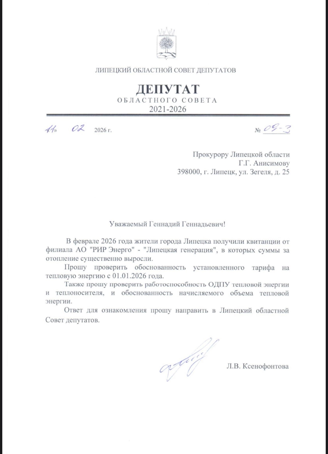 Депутат Областного совета, Председатель РО партии "СПРАВЕДЛИВАЯ РОССИЯ" в Липецкой области Ксенофонтова Лариса Васильевна обратилась с официальным запросом к прокурору Липецкой области, чтобы выяснить точные причины увеличения тарифов на тепловую энергию, вступивших в силу с 1 января 2026 года. А также обоснованность начисляемого объема тепловой энергии.